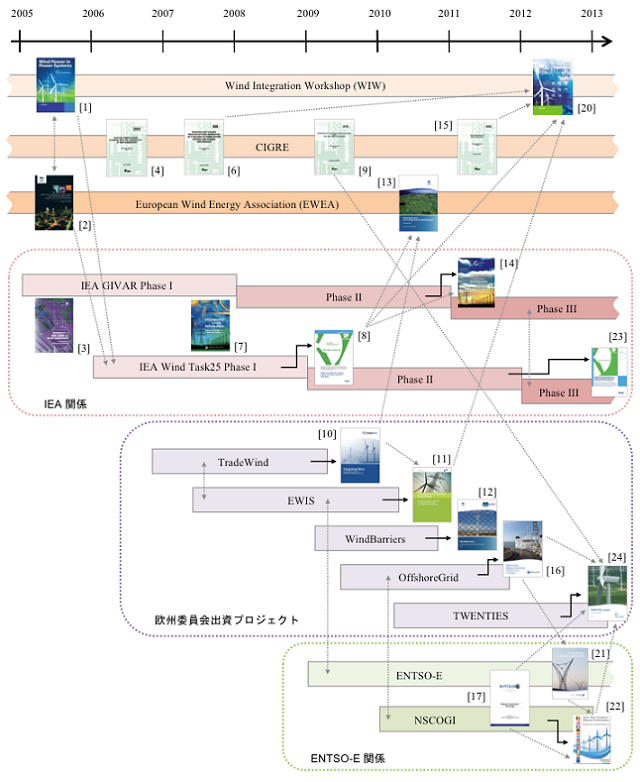 図1は、一昨年(2013年)の段階で筆者がまとめた風力発電の系統連系問題に関する欧州の諸研究(学会や国際機関、研究組織、産業界団体、官民開発プロジェクトの書籍、調査報告書、成果報告書)の系譜です(2013年段階のまとめであるため、前述のIEAレポートはこの図では登場しません)。ご興味のある方は文献[4]を参照頂くこととして、ここでは図の流れと雰囲気だけ追って頂ければと思います。