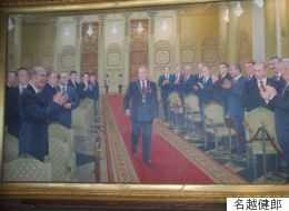G7(主要7カ国)とCIS(独立国家共同体)指導者に囲まれたナザルバエフ大統領の絵。アスタナの独立宮殿に飾られ、大統領の個人崇拝を示している。左端が小泉元総理