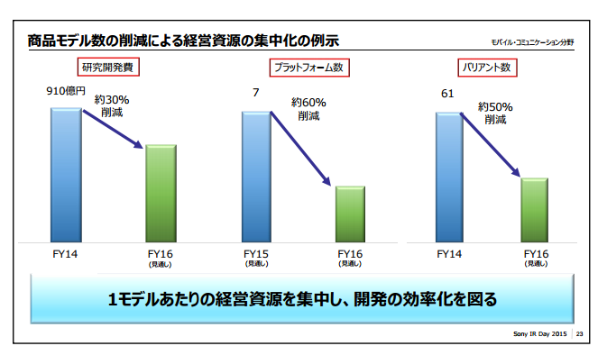 スマホ事業子会社、ソニーモバイルコミュニケーションズ(東京・港)は16年4月までに約2100人を削減するほか、16年度までに商品派生モデル数を14年度比で約5割減らす。本社機能も約6割を日本へ集約するなど、効率的に運営できるよう改革するなどしてコストを下げる。