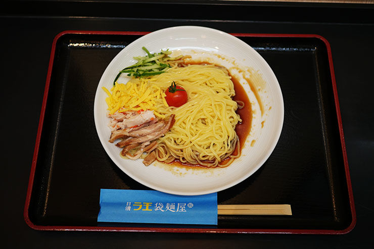 日清は『ラ王』の冷やし中華(袋麺)をスーパーやコンビニで販売しているが、この食堂では、お金を払うだけで肉や野菜が盛られた『ラ王』の冷やし中華を作ってくれるのである。つまり、普通の食堂で冷やし中華を食べるような感覚でインスタント麺を堪能できるのだ!!