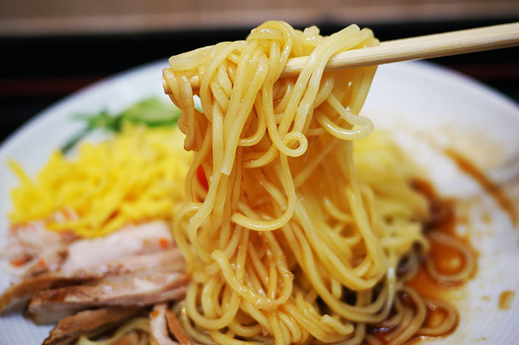 「日清『ラ王』の冷やし中華は太めでツルツルとした表面が特徴なんですよ。レシピどおりの湯で時間でも良いのですが、湯で時間を20~30秒ほど短縮すると、よりコシが強くなり、リズミカルな動きで食感を楽しませてくれます。