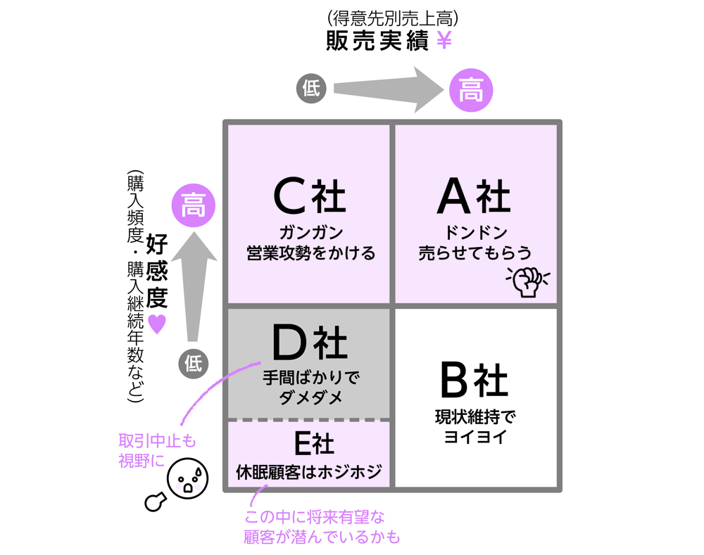中でも一番大事にしなければいけないのは、図表の右上ゾーンの「A社」です。「A社」は、忠誠度が高く、販売実績もある、望ましい既存顧客だからです。