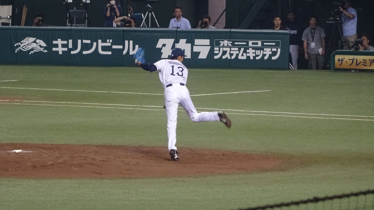 その残像の向こうに立っていた細身の青年。大きくも太くもない体躯を天高く伸ばし、全身をムチのようにしならせるダイナミックなフォーム。跳ね上げた右足の勢いだけを見れば150キロは出ようかという剛腕から繰り出される基本緩速球、ときどき剛速球。しかし、速球など飾りだと思わせるようなキレで縦に大きく落ちるスライダー。新たな時代と、ちょっと不吉な13番を背負った青年は、テレビで見ていた黄金時代の残像をすぐに忘れさせてくれました。