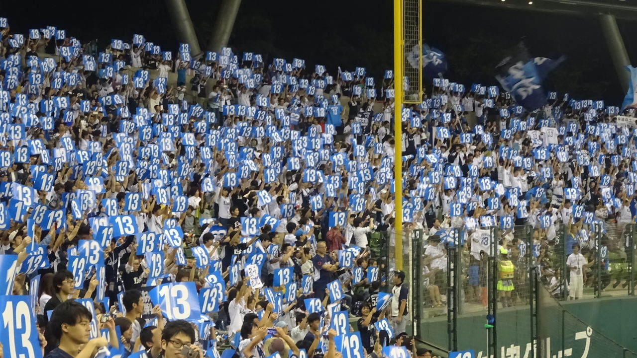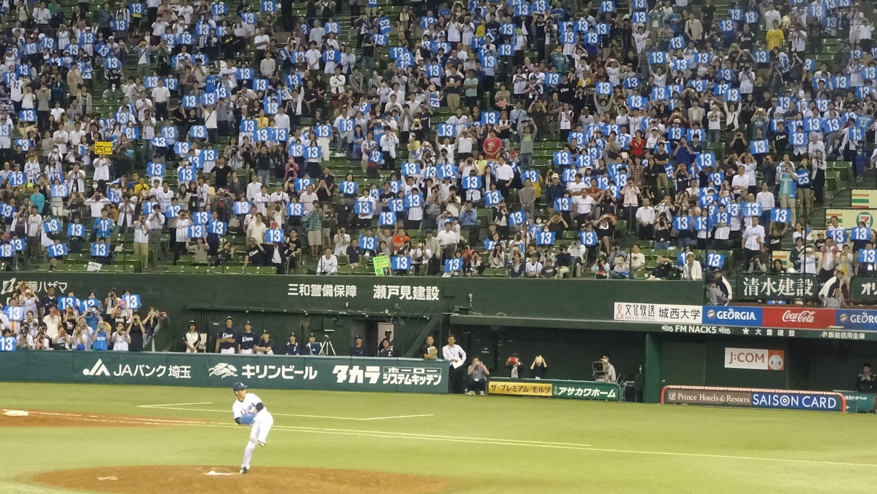 この日の来場者には西口文也の足跡を記したメモリアルチケットと、ライオンズブルーに白い文字で13の数字を入れた応援ボードが配られました。勝利はもちろん欲しいが、それよりも大切なことがある。そんな想いが、ライオンズの人々を今日ここに集まらせた。ビッシリと埋まったスタンドは、それだけ多くの「ありがとう」が西口に向けられているということ。西口の「西」は西武の「西」。何もかもが約束された幸せのように思えてきます。