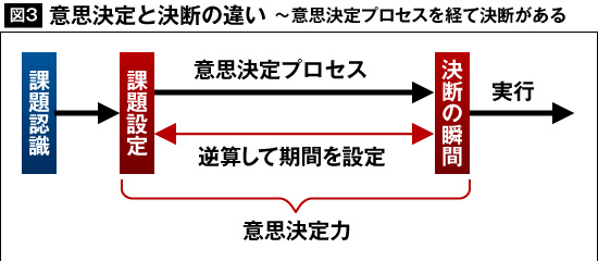 決断力というと、トップが英雄的なリーダーシップをもって、ある瞬間に決める…といったイメージをお持ちでしょう。しかし、決断の瞬間にできることは、実はあまりないんですね。そもそも決断の目的や選択肢といった検討すべき事項は、それ以前に整理されてしまっているからです。仮に選択肢が複数あったとしても、どちらかに決めるというだけの話。どっちに転んでもメリットもデメリットもあるという状況だからです。決断というのは、極めて自由度の少ない中で行う行為といえるでしょう。