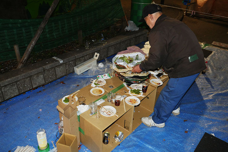 散らかすというより、そのまま放置して帰宅したのだ。あまりにも最悪の状況に呆然としてしまった。「これは誰が掃除するのだろうか?」と思っていたところ、見かねたホームレスの男性がごみを分別し、せっせと放置されたゴミを片付けはじめた。ホームレスの男性は「マナーというものを知らんのだな」と話す。