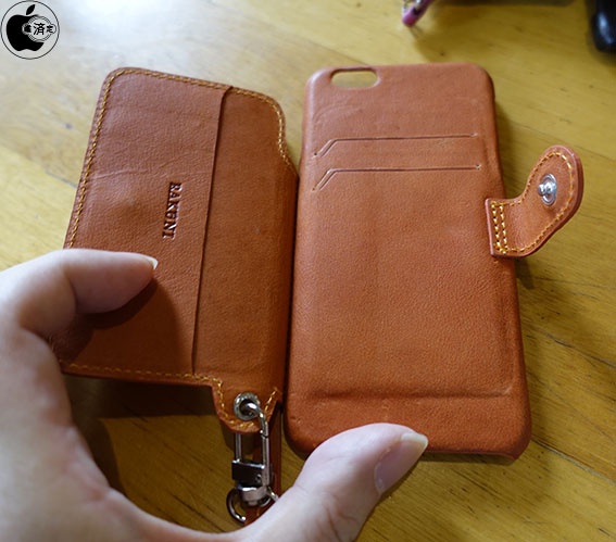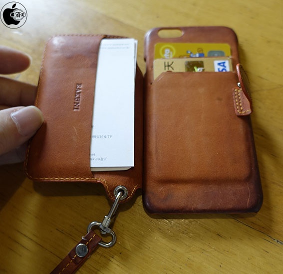 実際にカードポケットに、クレジットカードや名刺などが入った状態で使用しているRAKUNI Leather Case with Strap for iPhoneを見せてもらいました。
