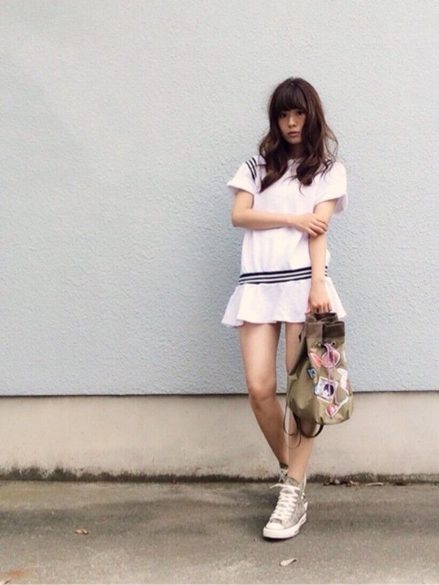 スポーティーなミニ丈のワンピースは、大人になると敬遠してしまいますが、スポーティーだからこそ大人でもOKなのです♪ 迷彩柄のハイネックスニーカー、そしてバッグにいたるまでカーキのミリタリー風なものを選んでカジュアルダウン。大人でもOKのスポーツMIXコーデが魅力的ですね。