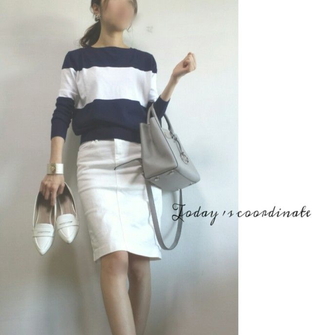 ミニ丈には抵抗がある方は膝丈のスカートを選べば足の露出を抑えられます。カジュアルなマリンスタイルならコーデのテイストにぴったりマッチしているので自然になります。足元はローファーやスリッポンにするとよりカジュアルになるのでチャレンジしやすいですよ♪