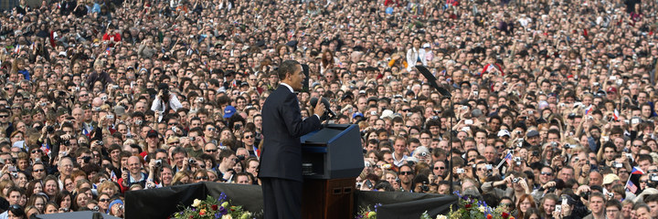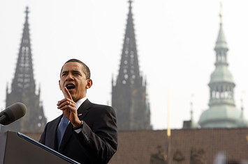 2009年4月、プラハで核廃絶を訴えるオバマ大統領 Jim Young / Reuters
