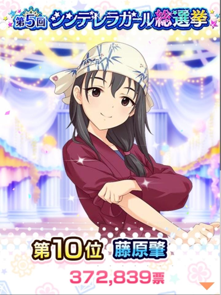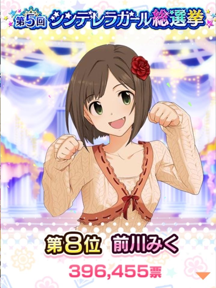楓さんと比較したら酷だけど、ちゃんみお、ウサミン、みくにゃんも既存ボイス組でガチャブ無しでこの投票数・この順位。さすがである。