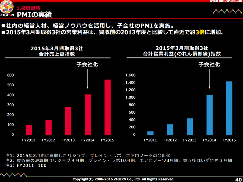 実際の売上高や営業利益ではなく指数なのですが、PMIで実績が出ていることは確かです。PMIを前提としたM&Aを仕掛けるのでしょうね。今後は企業買収のみならず事業買収もありそう。低価格での事業買収はイードがお得意とするパターンですね。被買収企業よりじげん社員の方がスペック高い場合が多いでしょうし、事業買収の方が良いのかもしれない。