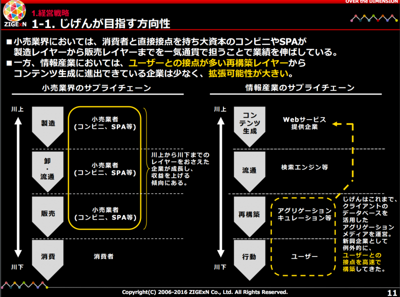 サプライチェーンの垂直統合:情報の再構築やユーザー集客への特化から、流通、コンテンツ生成までの機能を拡張して内製化し、新たな付加価値の創出を目指す。