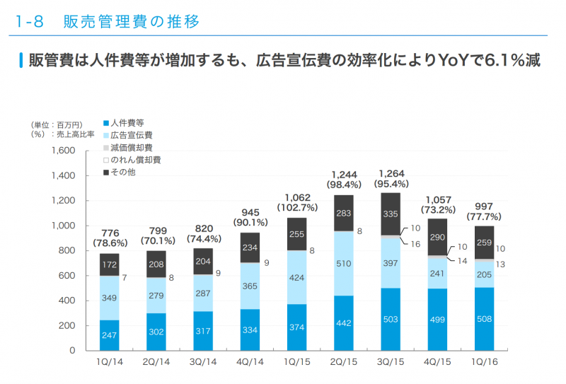 2015年4Qが微減以外は増加トレンド。2015年3Qからはwaja買収で膨れている側面もあるのでしょうが。正社員と派遣・アルバイト比率は見つけられませんでしたが、全て合算すると448名とじげんの社員数の2倍強。そりゃ人件費も2倍近く掛かります。