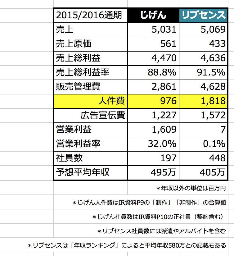 じげんとリブセンス比較:リブセンスの人件費が約2倍