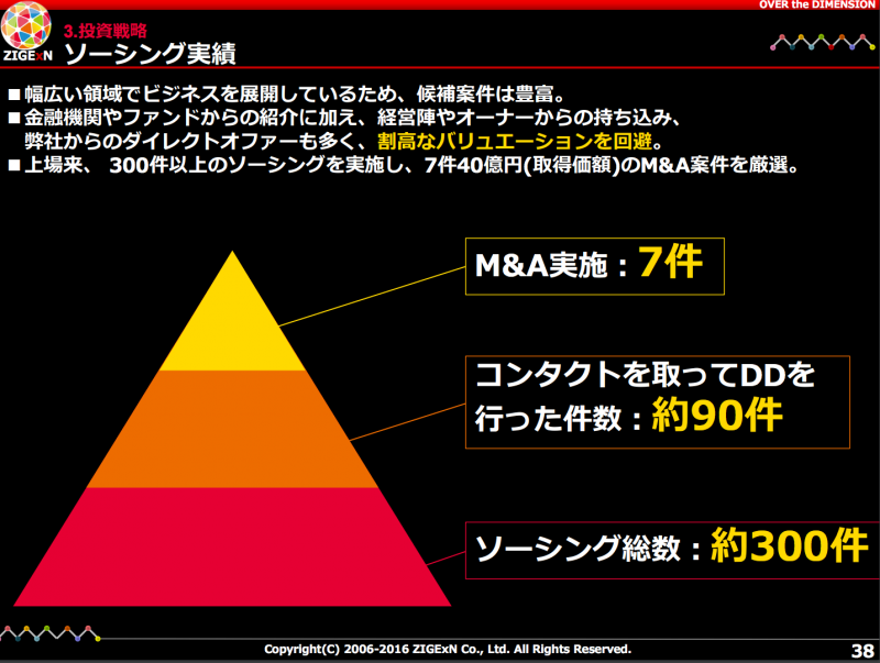 上場来M&Aに積極的なじげん。一番大きい案件はリジョブの19.8億円でしたが、もう7件もやっているとは。これまた黄色文字で記載がありますが「割高なバリュエーションを回避!」w