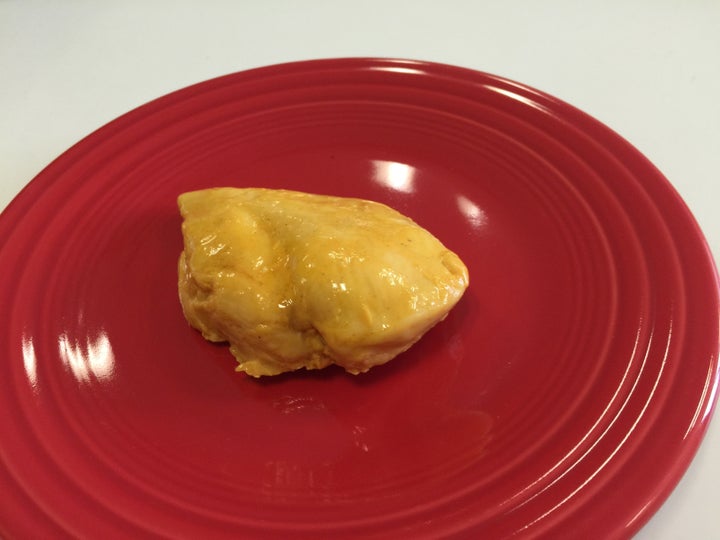サラダチキンを美味しく撮るのは非常に難しい。かわいい真っ赤なお皿に置いたものの、これでよかったのか。