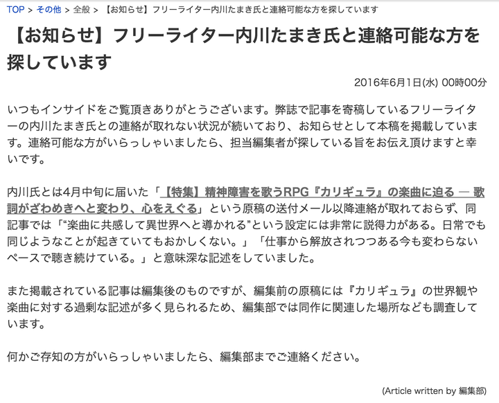 問題の記事はこれだ。「お知らせ」という形で、行方不明になったフリーライターに関する情報提供を呼びかけている。