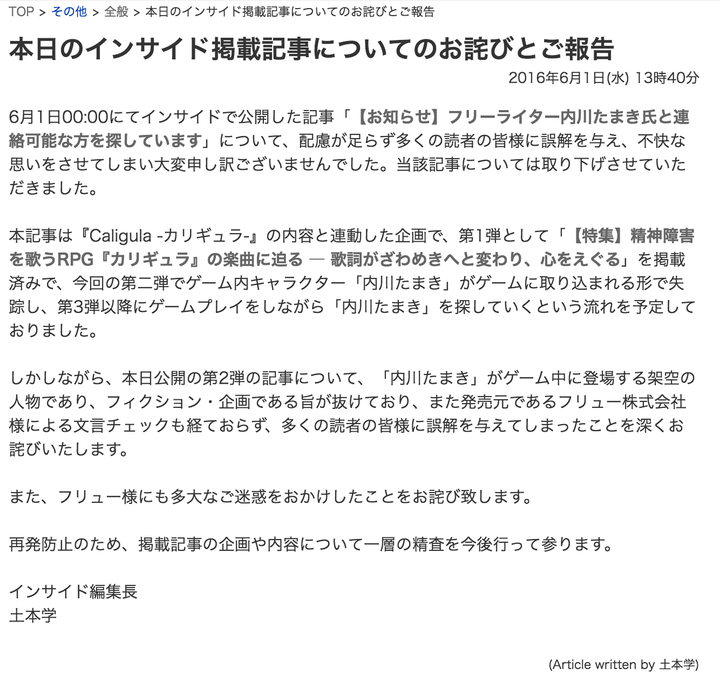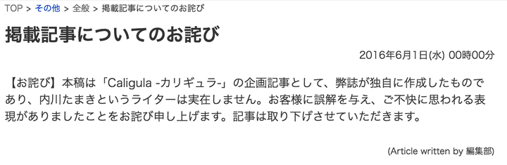 当初掲載した記事は「Caligula」というゲームを紹介する企画で、「内川たまき」は実在しないという。