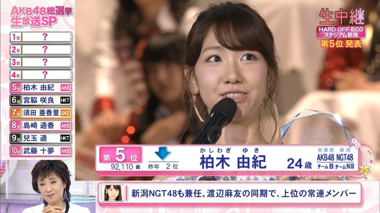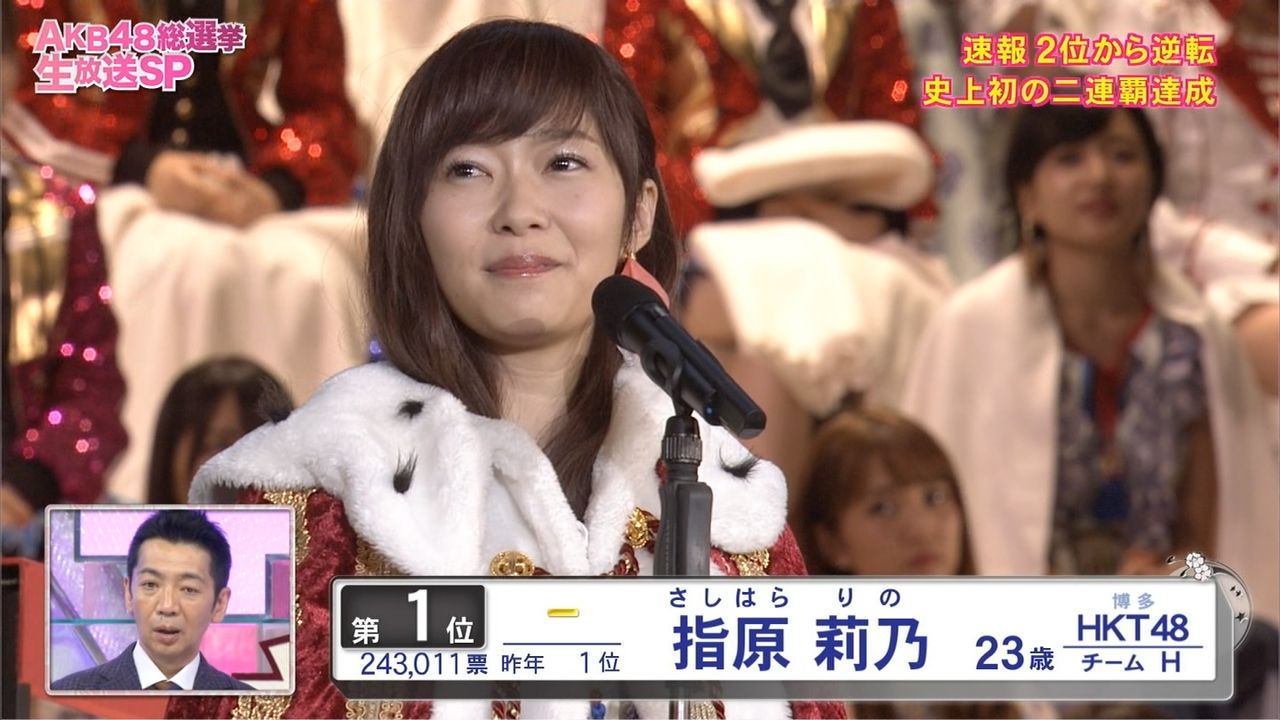 AKB48の45枚目のシングル(タイトル未定、8月31日発売)の楽曲を歌う選抜メンバーを決める『第8回AKB48選抜総選挙』が開票され、HKT48チームHの指原莉乃(23)がAKB48総選挙史上初の2連覇に輝いた。2位は2年ぶり女王奪還を狙っていたAKB48チームBの渡辺麻友(22)となった。
