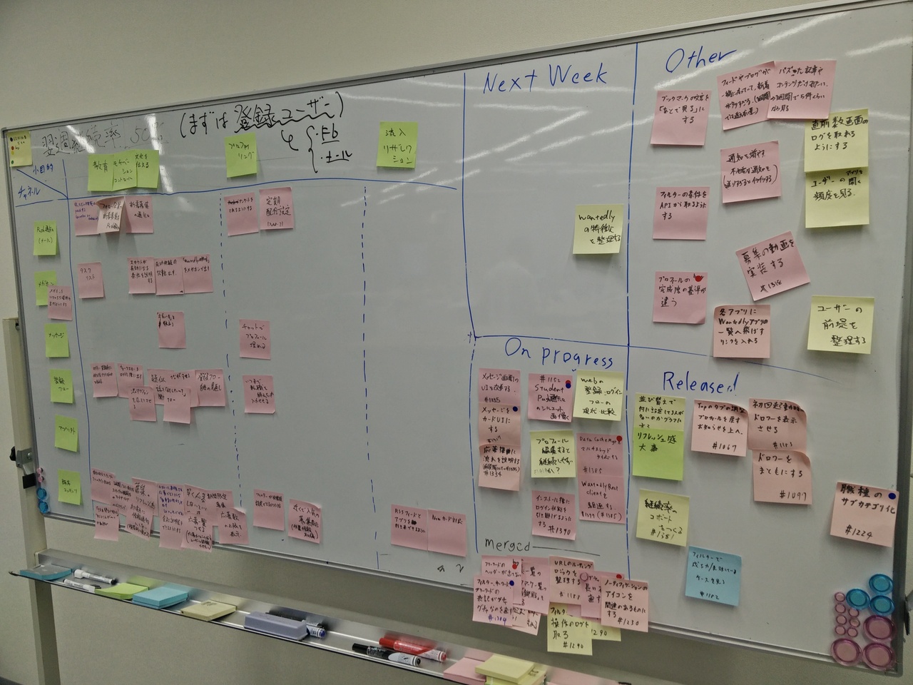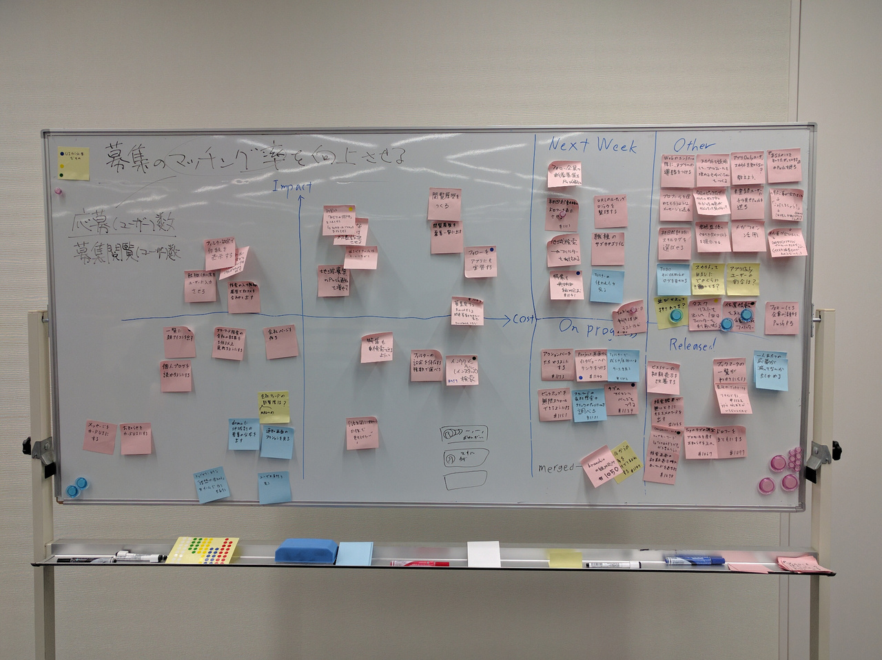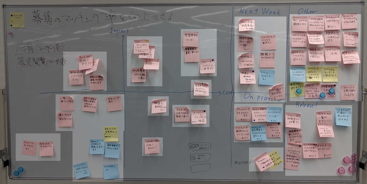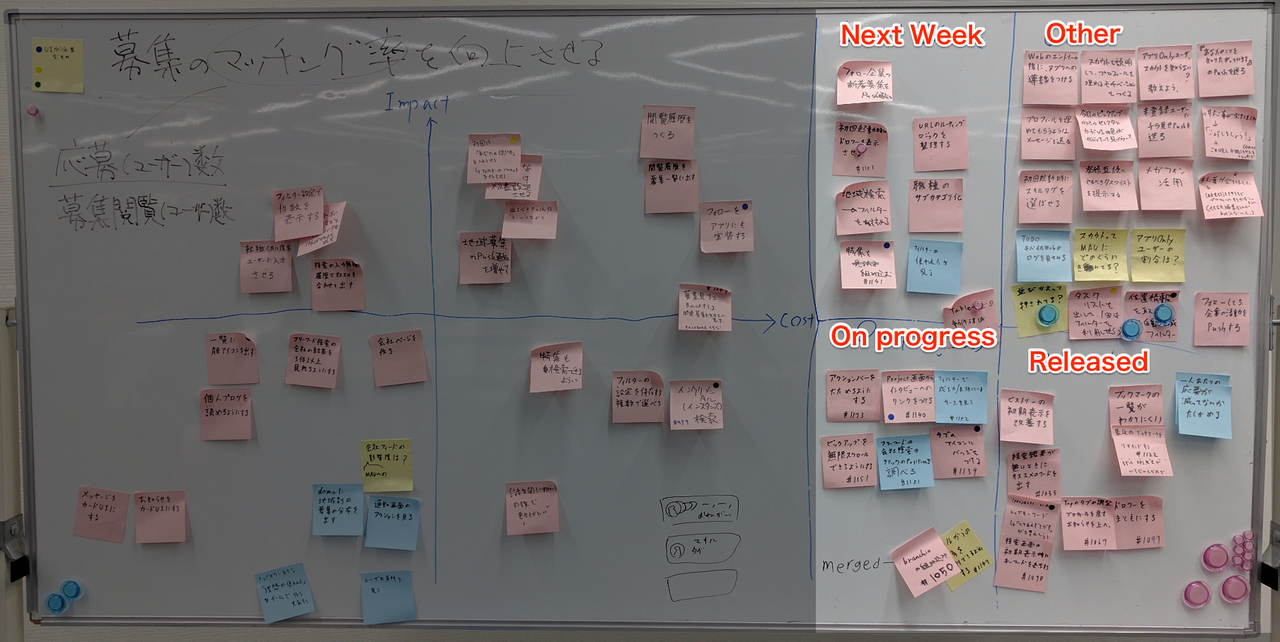 これらのセクションは各施策の進捗を管理しています。私たちは毎朝このボードの前で5分程度のミーティングを取り、その際に軽く進捗を話したり、セクション間の移動をしています。