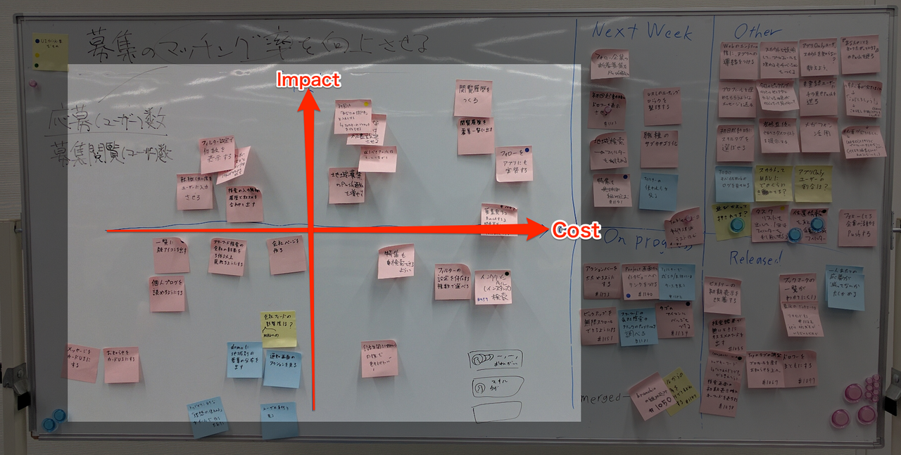 次にマッピングです。ボード左側のプールは コスト軸, インパクト軸 でマッピングしています。