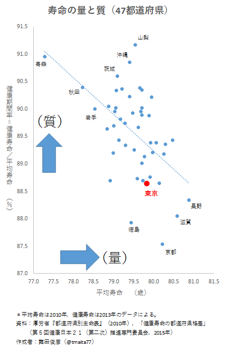 右下の長野,滋賀,京都などは,長生きできるが,寝たきり等の状態で過ごす期間も相対的に長いと。左上の青森や秋田は,寿命は短いが「ポックリ」逝ける県ということになるでしょうか。
