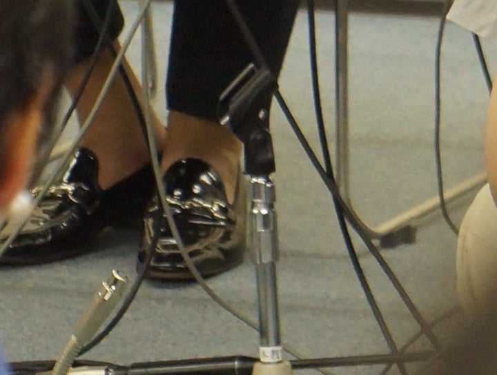 普段のイメージとは異なるダークトーンのスーツに、白いシャツ、紺のネクタイを締めて現れた。足元だけはイメージ通り、素足にローファーでまとめる。