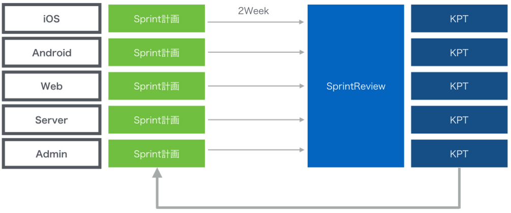 AbemaTVは、5つの開発チーム(iOS、Android、Web、Server、Admin)から構成されています。基本的には各チームでSprint計画を立て、その計画に従って開発を進めていきます。