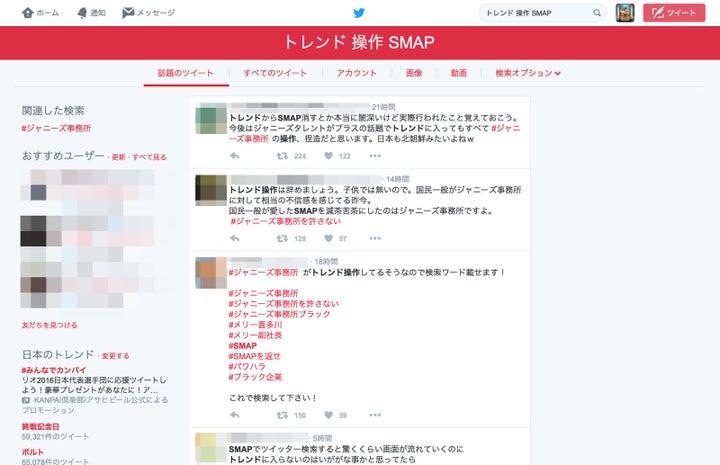 SMAPの解散発表を巡って、Twitterの「トレンド」欄が不正に操作されているとの噂が飛び交っている。