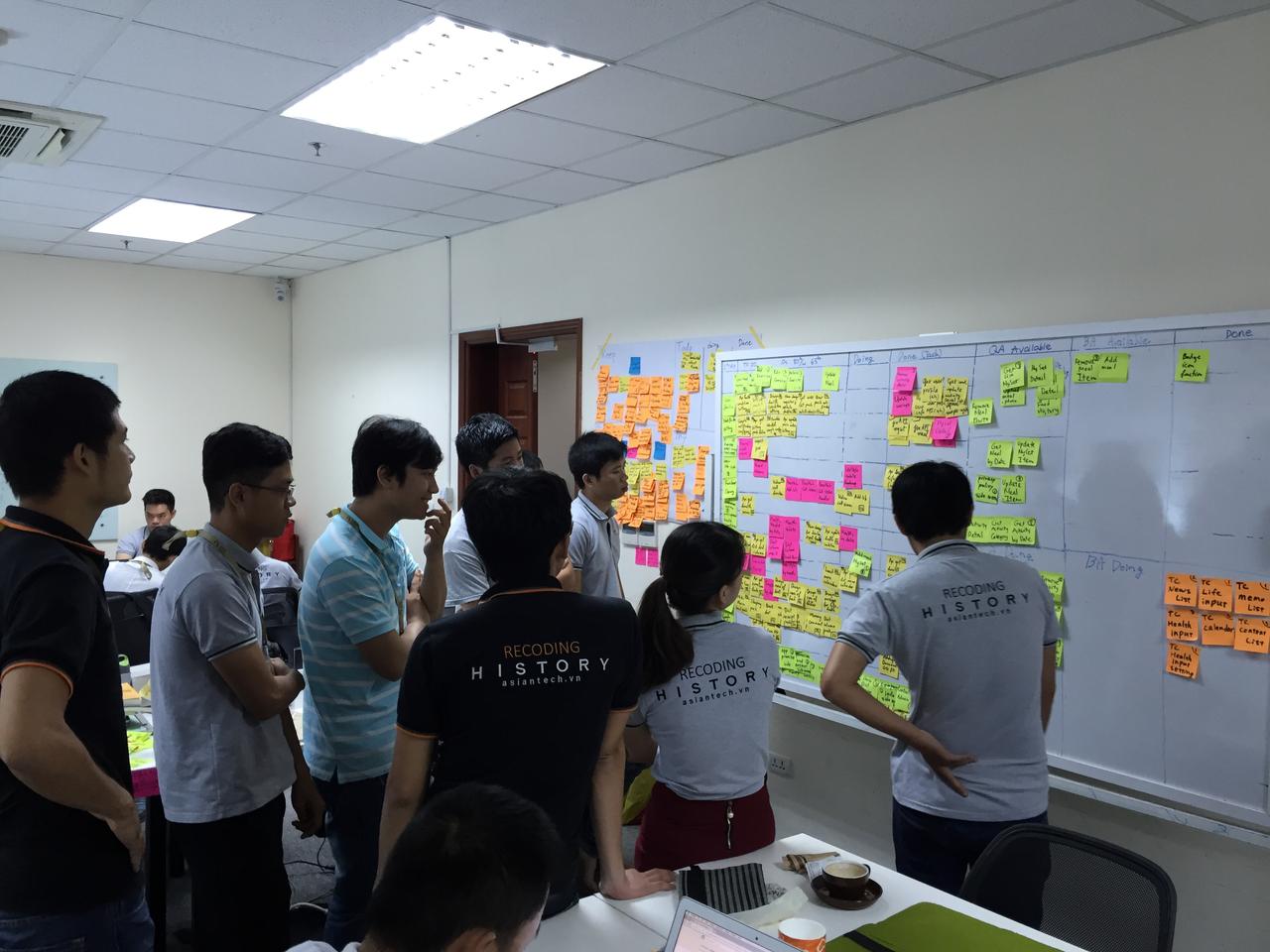 具体的には、ホワイトボードとPostItを使ったカンバンの導入、カンバンの前で毎朝立って行なう朝会、プランニングポーカーを使ったポイント見積もり、プロダクトバックログの作成、プロダクトバックログとベロシティを使った計画づくり、KPTを使ったふりかえりなどです。