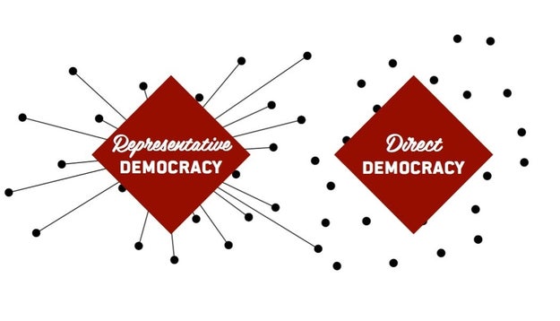 直接民主主義(右)と代議制民主主義(左)のイメージ