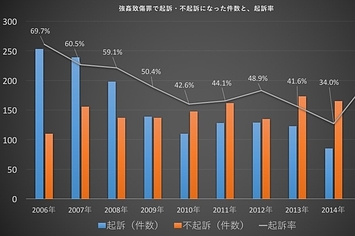 どれぐらいの割合で起訴されるかを示す起訴率も下落傾向にある。2006年には69.7%あったのが2014年には34%になった。