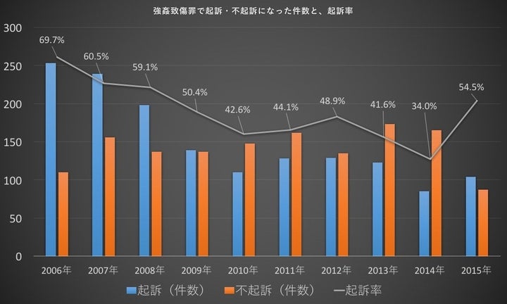 検察統計によると、起訴された件数は、2006年には253件、2007年は239件だったが、2014年は85件、2015年は104件と減少している。