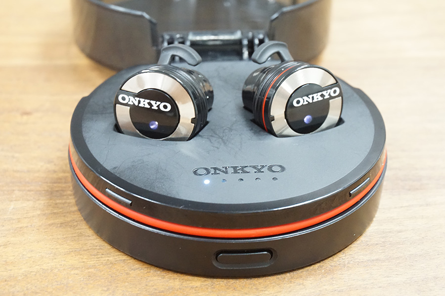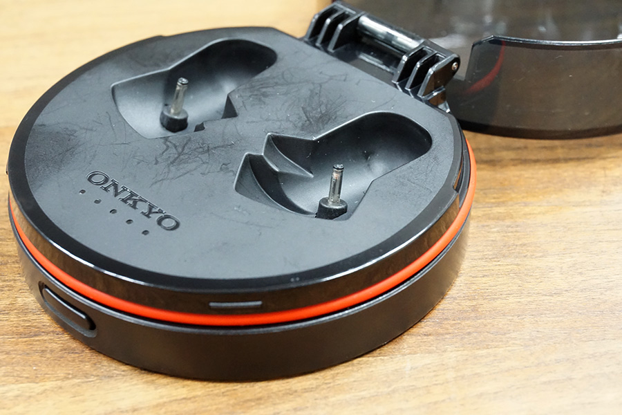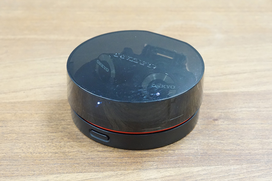 オンキヨーのケースを使っていて感じたのは、まずデカいこと。たとえば他社製なら、EARINのケースはスティック型、Aria Oneのケースは卵型と、いずれもポケットにしまえるほど小さい。いっぽう、W800BTは背の低い筒状であり、片手で包むことが難しいほどのボリュームがある。また大きい分、樹脂製のフタは強度的な不安がある。持ち運ぶときはクッション性の高いポーチに入れるなどしたほうがよいかもしれない。