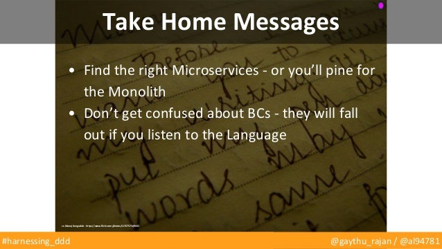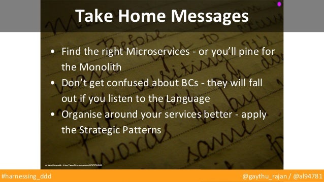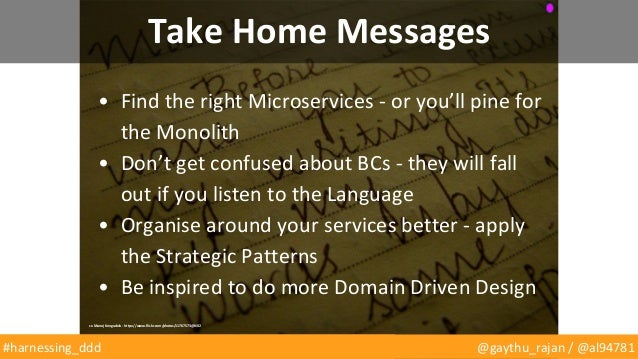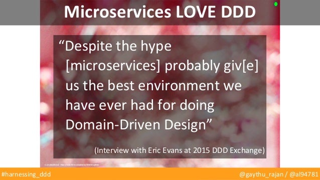 We'll begin by laying out what DDD means to us based on experiences we've had building microservices with distributed teams over the last two years. We'll touch lightly on the well-understood elements such as "ubiquitous language", "intention revealing interfaces" and "hands on architects", before clarifying and explaining the much misapplied concept of "bounded contexts".