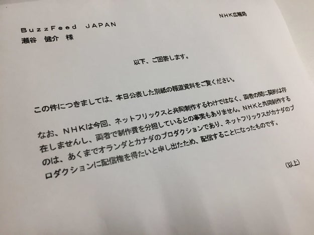 「NHKと共同制作するのは、あくまでオランダとカナダのプロダクションであり、Netflixがカナダのプロダクションに配信権を得たいと申し出たため、配信することになったものです」