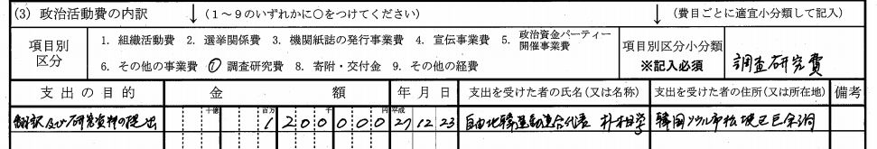 ¤Þ¤º¼ýÆþ¤È¤·¤Æ¡¢¡ÖËÝÌõµÚ¤Ó»ñÎÁÄó½Ð¡×¤È¤·¤Æ¥Æ¥ì¥ÓÄ«Æü¤«¤é120Ëü±ß¤ò¼õ¤±¼è¤Ã¤Æ¤¤¤ë¤³¤È¤¬µÏ¿¤µ¤ì¤Æ¤¤¤ë¡£¤½¤·¤ÆÀ¯¼£³èưÈñ¡Ê¼ý»Ù¡Ë¤ÎÆâÌõ¤ËÌܤò¤ä¤ë¤È¡¢¤Ê¤ó¤È¤½¤Î120Ëü±ß¤¬¤½¤Î¤Þ¤Þ¡ÖËÝÌõµÚ¤Ó¸¦µæ»ñÎÁ¤ÎÄó½Ð¡×¤È¤·¤Æ¡¢´Ú¹ñ¡¦¥½¥¦¥ë»Ô¤Ë¤¢¤ë¤È¤µ¤ì¤ë¡Ö¼«Í³ËÌ´Ú±¿Æ°Ï¢¹ç¡×¤È¤¤¤¦ÁÈ¿¥¤Ë²£Î®¤·¤µ¤ì¤Æ¤¤¤ë¤³¤È¤¬¤ï¤«¤ë¤Î¤À¡£¥Æ¥ì¥ÓÄ«Æü¤Î»ñ¶â¤¬´Ú¹ñ¤ËÅϤäƤ¤¤ë¤Î¤Ç¤¢¤ë¡£