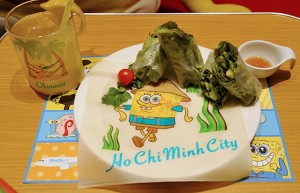 ホーチミンをイメージした「野菜たっぷり生春巻」(右)と沖縄をイメージしたトロピカルパインジュース=16年12月14日 PHOTO: Yusuke KOHASE/Aviation Wire