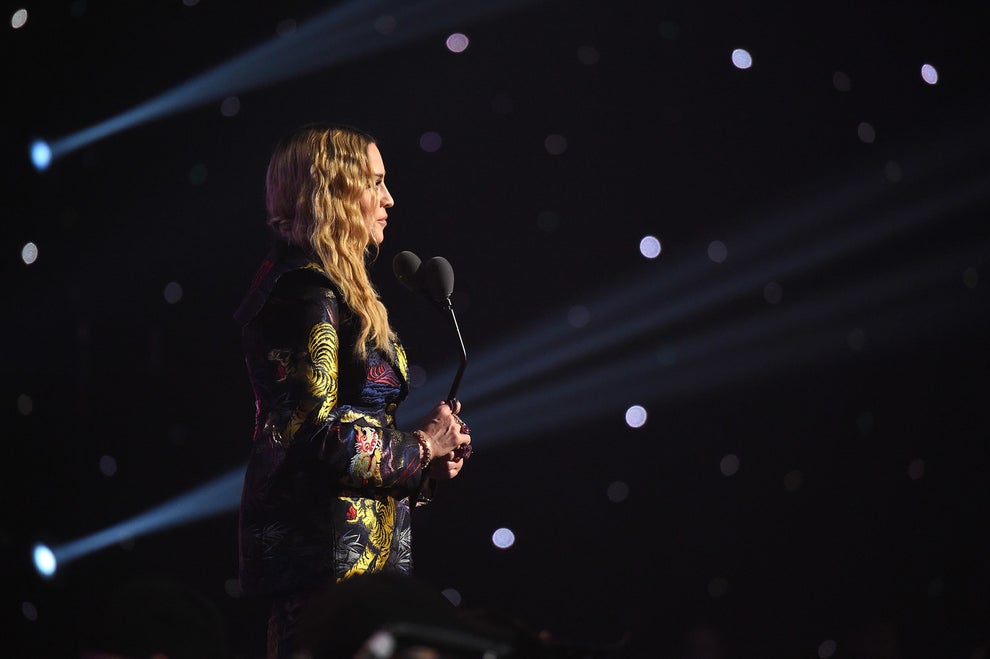 グッチのスーツに身を包んだマドンナ。12月9日、ビルボードの「ウーマン・オブ・ザ・イヤー」に選ばれ、女性を励ますメッセージを発した。「ファック!私はバッドなフェミニスト」。マドンナ流の言葉で。