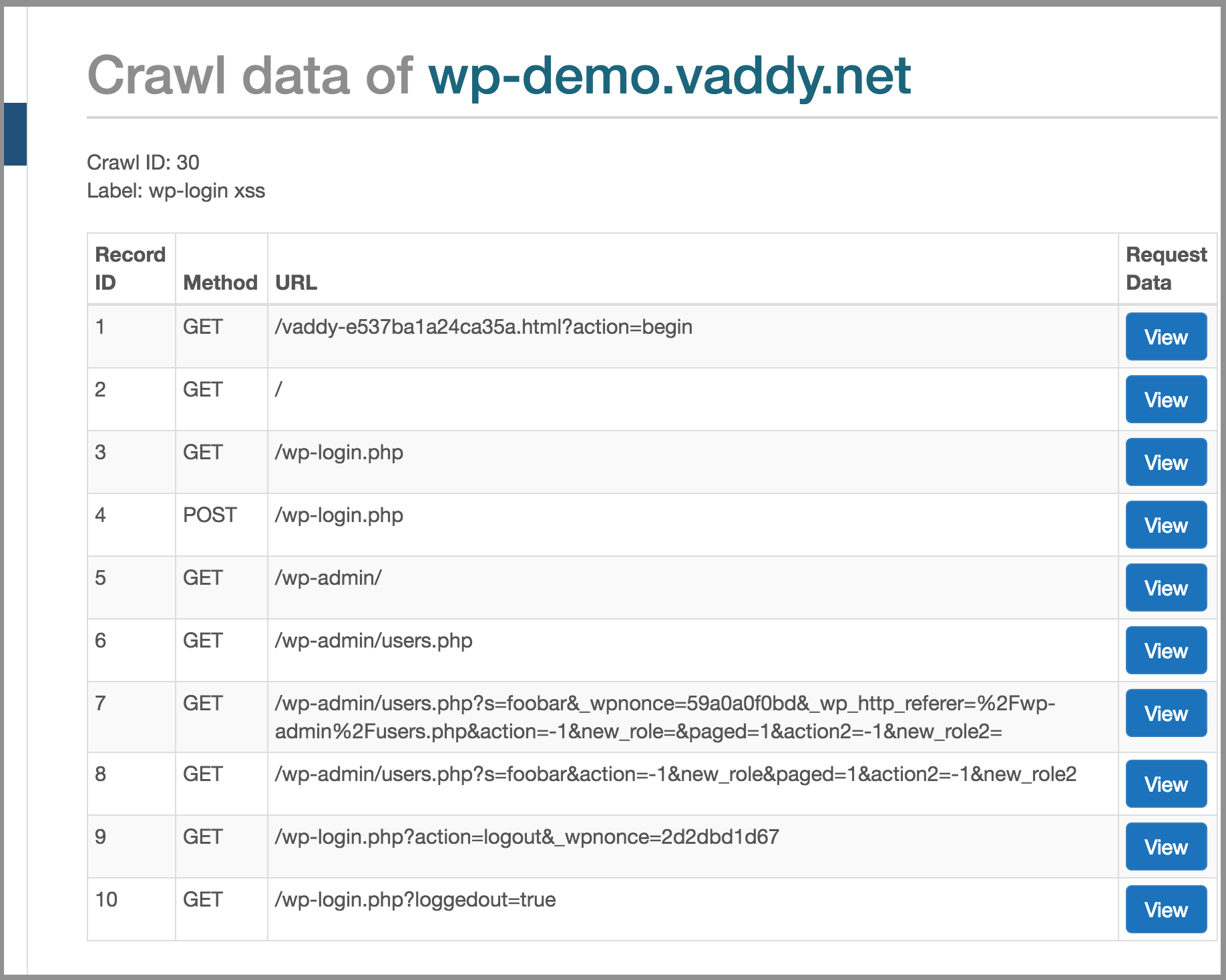 VAddyのクロール画面で内容を確認してみます。8行目にちゃんと/wp-admin/users.php?s=foobarがありますね。
