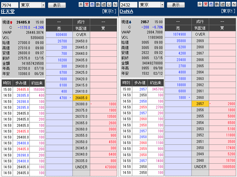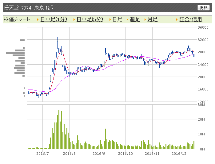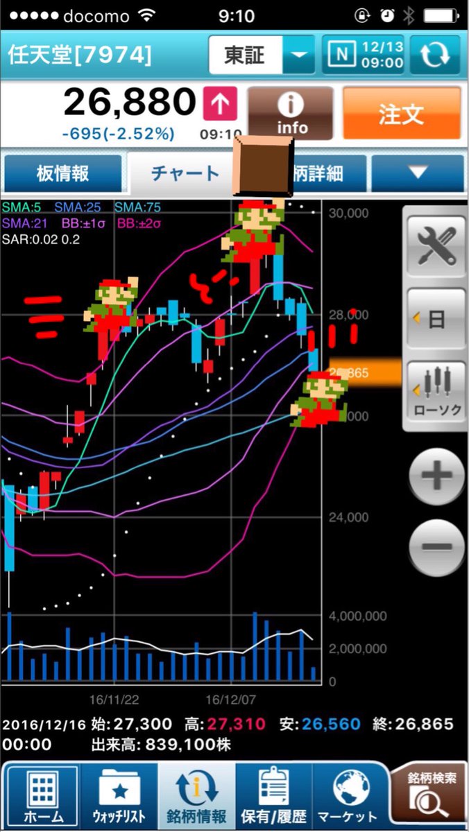 『スーパーマリオラン』が出て利益確定だか失望だかなんだか知らんけど、任天堂株が暴落中!任天堂株は最低の100しか持ってないんでよかったけど、たくさん仕込んでたDeNA株も暴落中!買い増すか損切るか悩みどころ!やべえええーーーー!