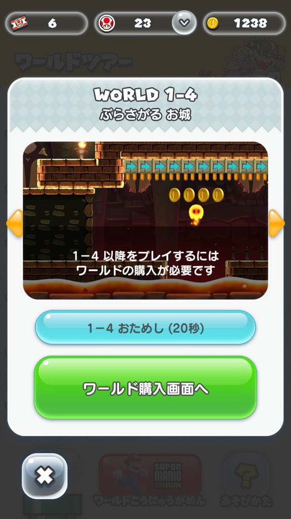 1-3までが単純に面白くないのが一つと1-4をお試しで遊べるけど20秒だけでギリギリクッパに辿り着く前に終わるのでボス戦が面白いのかつまらないのか分からなくて1200円ポンと払うのには躊躇する