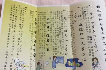 「このパンフレットは、見知らぬ人から被害を受けることを想定して、書かれています。しかし、実際には知人からの被害も多い。『性犯罪を防ぐ』と言う以上、性犯罪の全体像を伝えたうえで、より具体的で実現できる防犯行動に繋げていく必要があると思います」