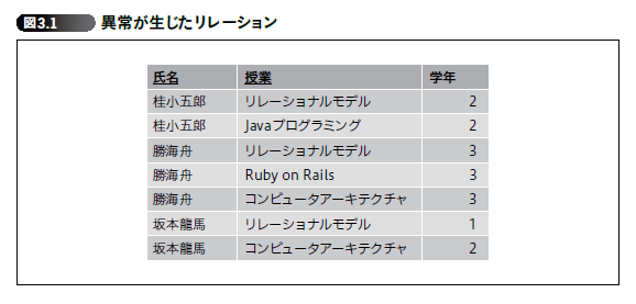 図3.1のリレーションのどこに矛盾が生じているのでしょうか。このリレーションに登場する3 名のうちの1 名、坂本龍馬さんの学年に注目してください。