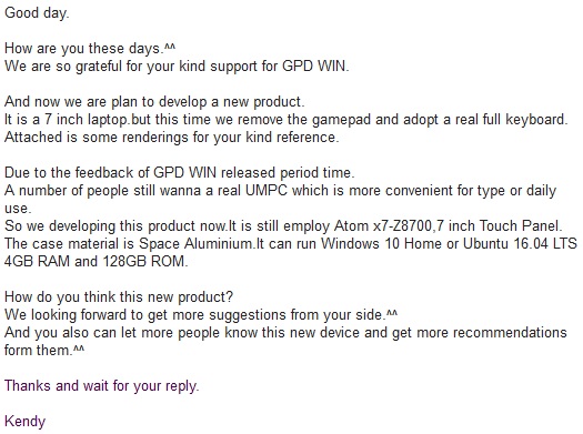 メーカー側(GPD)からのメッセージ