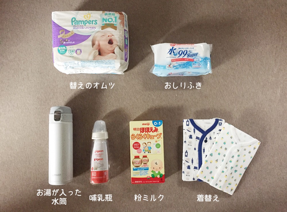 この他にも、使用済みのオムツなどを入れるビニール袋や、母子手帳、保険証、おもちゃなどをセットで入れるとのこと。