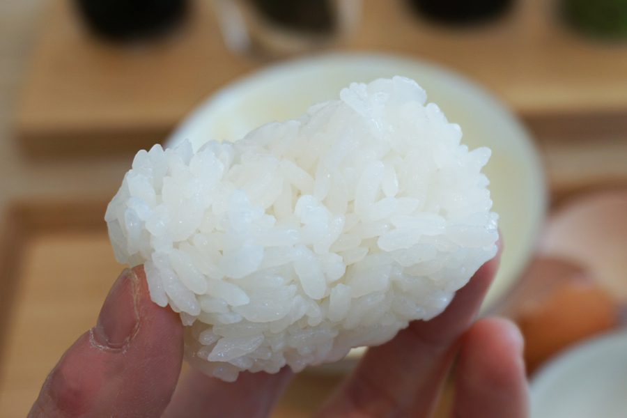 最後に食したのは、おにぎり。朝9時に炊き上がったごはんを握ったものを、4時間後にいただきました。おにぎりというと、どうしてもごはんが潰れ、ベチャッとした部分があるものですが、「BALMUDA The Gohan」で炊いたごはんでは中心部まで粒の崩れがありません。おにぎりでも粒感を感じられるとは、びっくりです