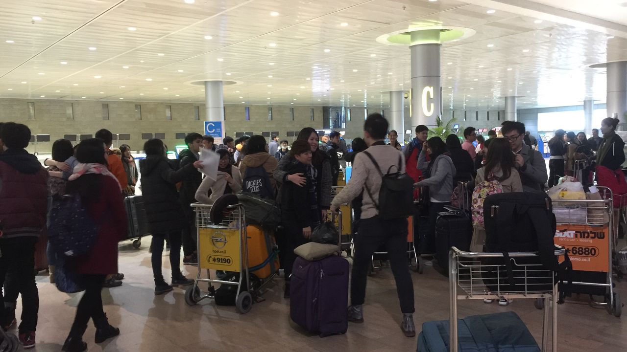 ↑テルアビブ空港を埋め尽くす中国人旅行客の群れ(2016年2月安田撮影)。