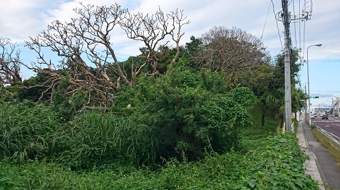 『ウフンミウタキ』の東側は、国道から集落へと続く脇道が隣接しており、丘の麓にはコンクリートブロック製の小さな構造物と水タンク(?)がありました。